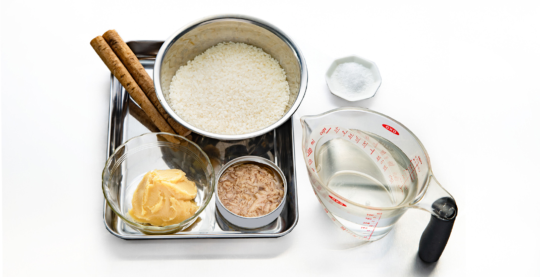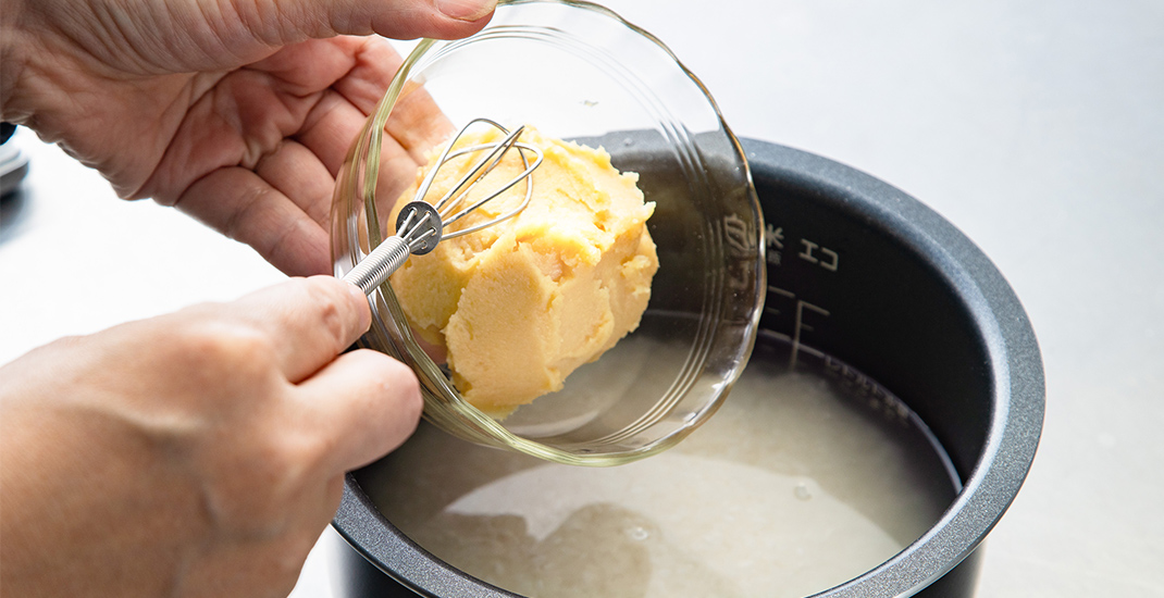 - 炊飯器の内釜に、米、塩、水を注ぎ、さらに味噌を加えて軽く混ぜる。