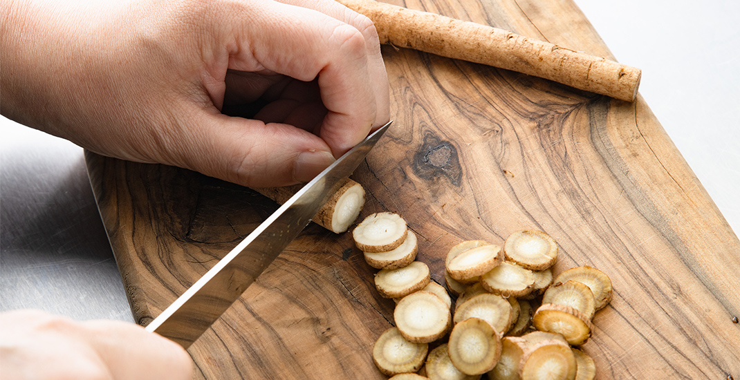 - ゴボウを薄く輪切りにする。