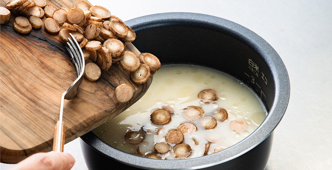 まず、ゴボウを輪切りにしたら、米・水・塩・味噌を炊飯器の内釜へ。