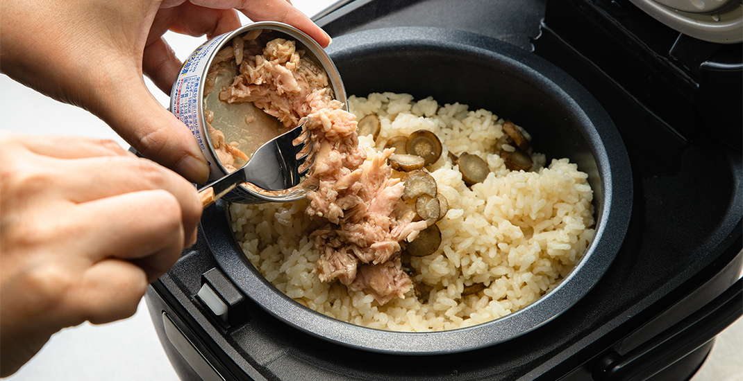 - 炊飯し、炊き上がったらツナの具を入れ、軽く混ぜる。 好みで黒コショウをふると 風味がよい。
