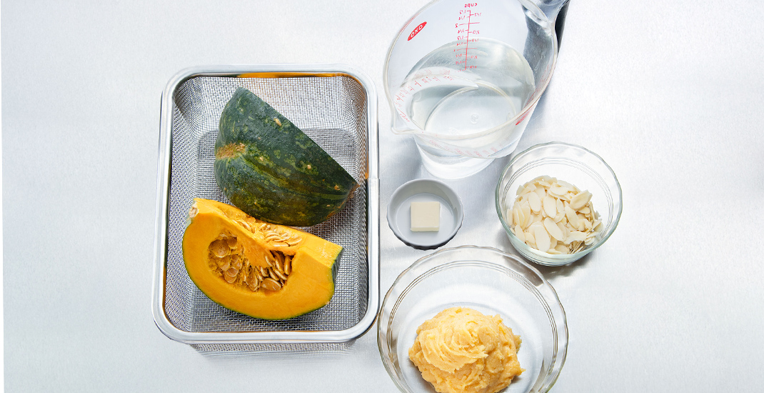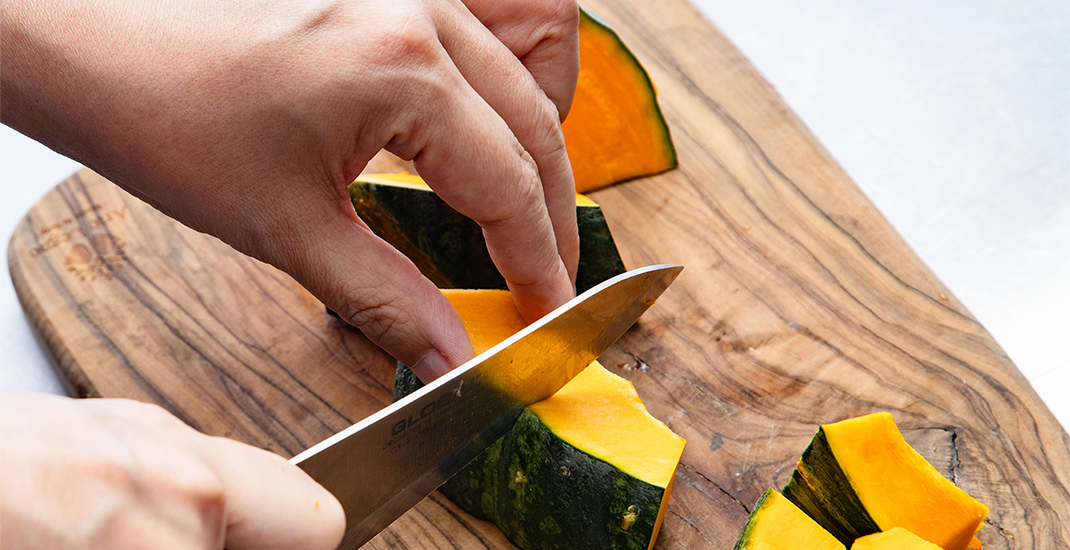- カボチャはワタとタネをとり、食べやすい大きさに切る。