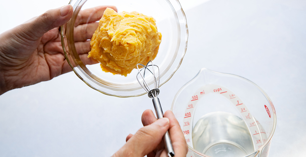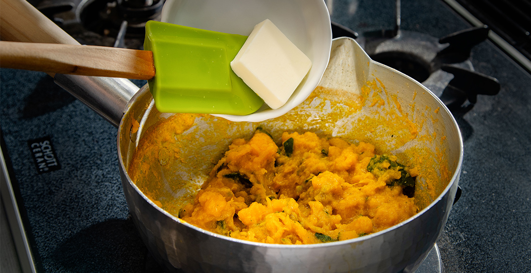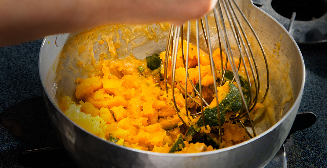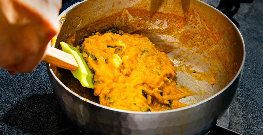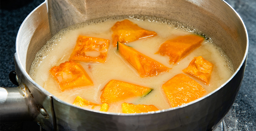 - 再び弱火にかけ、水分を飛ばしながら、カボチャをつぶす。